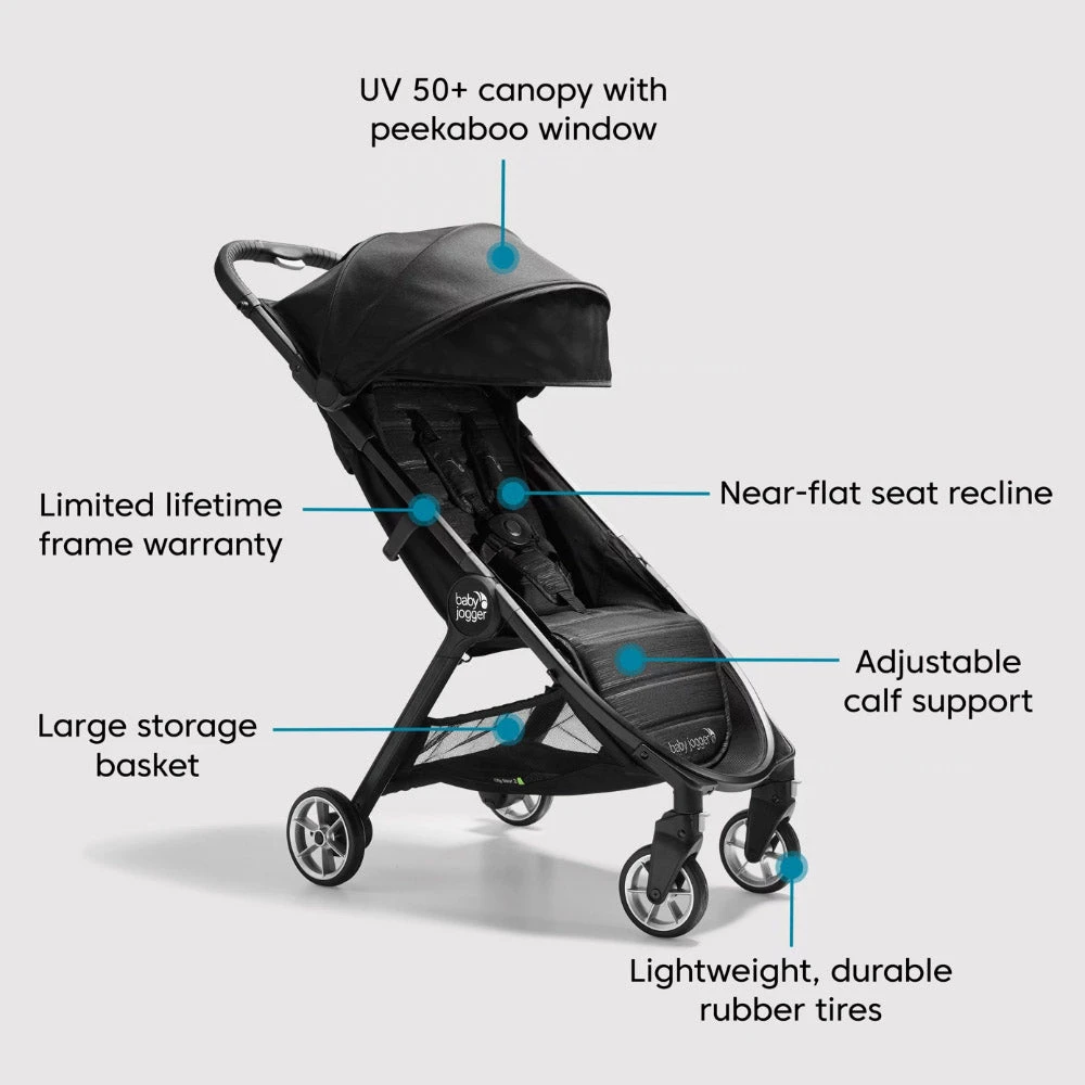 The Baby Jogger® City Tour™ 2 folds up small for big adventures—85% smaller than when it’s unfolded. The City Tour™ 2 is the ultimate stroller for travel, with an ultra-compact, one-step fold, a weight of only 14 lb, and an included carry bag. But despite its lightness, the City Tour™ 2 doesn’t skimp on features.