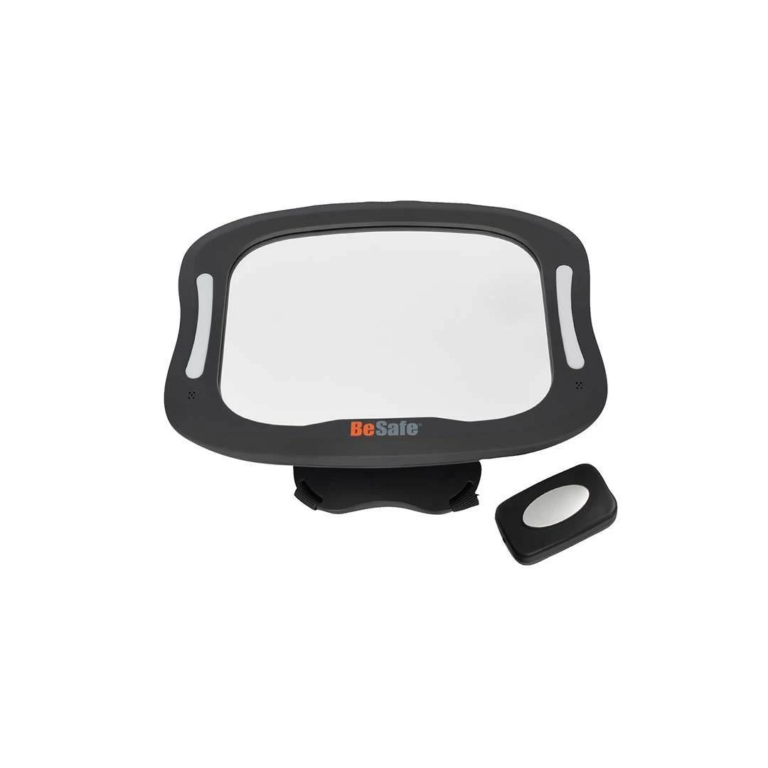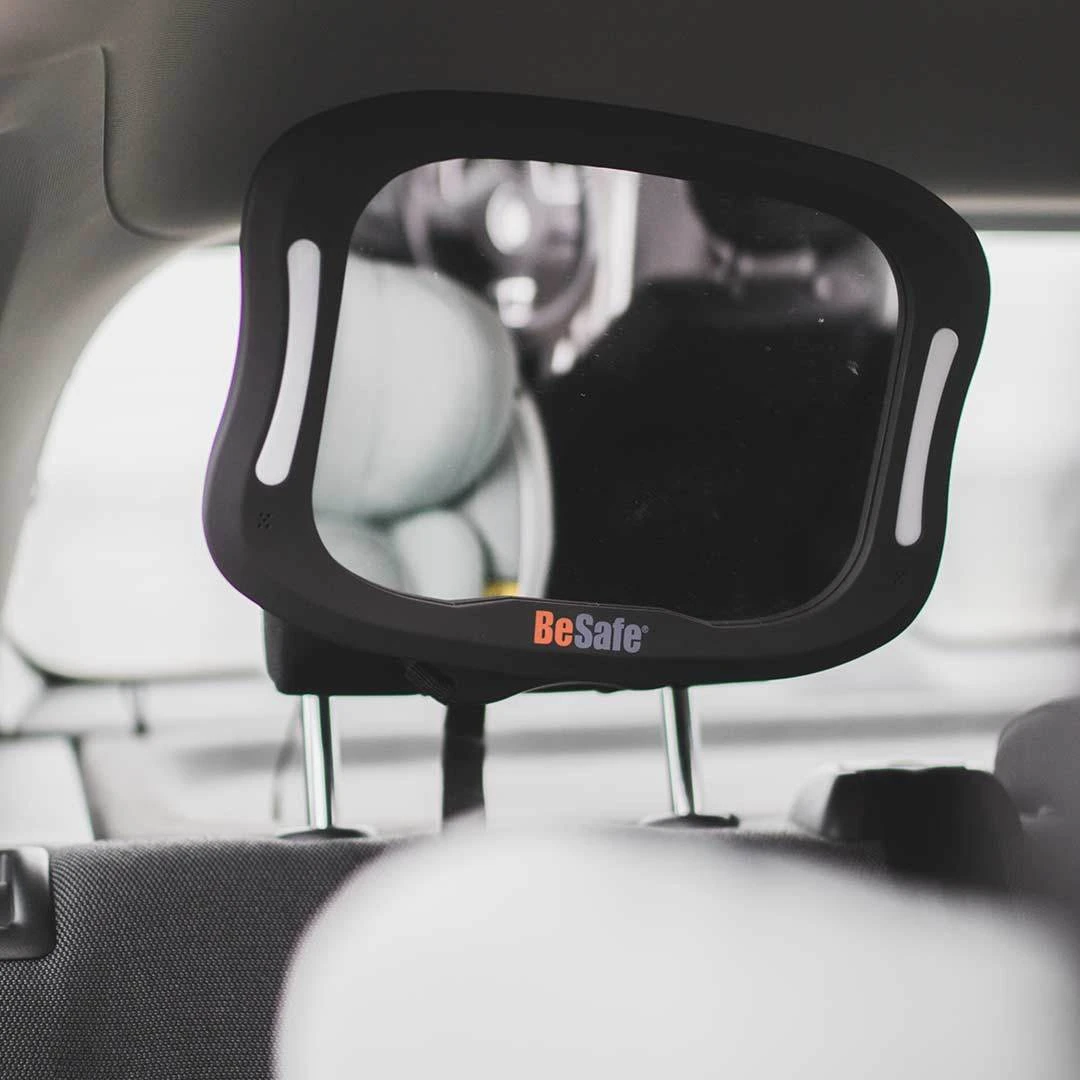 The new BeSafe Baby Mirror XL with Lights features a large surface area and rotating and tilting mechanism for an optimal view of your child through the rear-view mirror. Parents can press a small remote from the front seat and the light softly fades in, allowing you to see the child in the dark without waking them up. The remote can easily be clipped onto the car’s sun visor to always have it accessible. The BeSafe Baby Mirror XL with light has been crash tested for the highest safety.