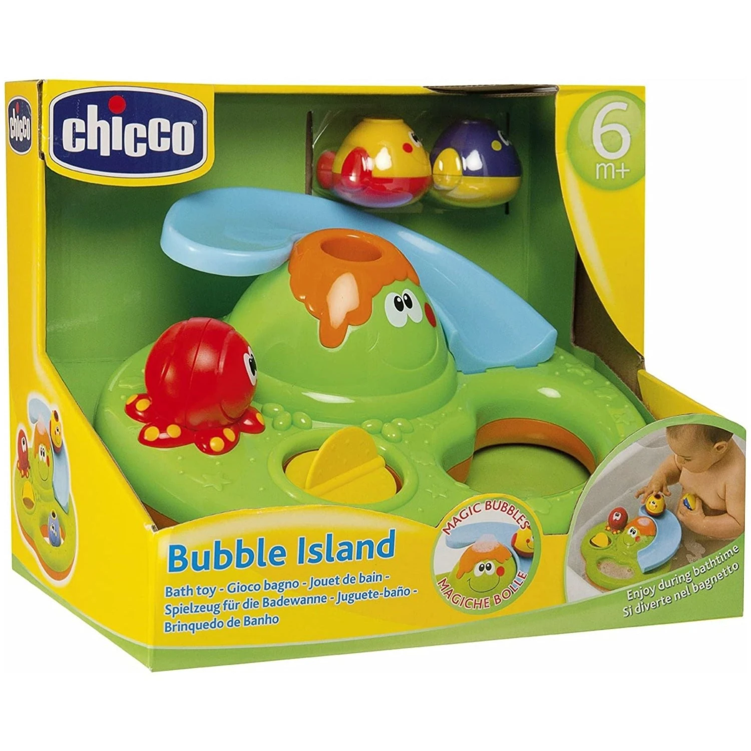 Bath tub activity centre for baby’s bathtime entertainment! Lots of great manual activities: a chute for the 2 little fishes to slide down. The water wheel spins to splash water effects. Baby can press the soft red Octopus to make fun soap bubbles erupt from the islands central volcano character.