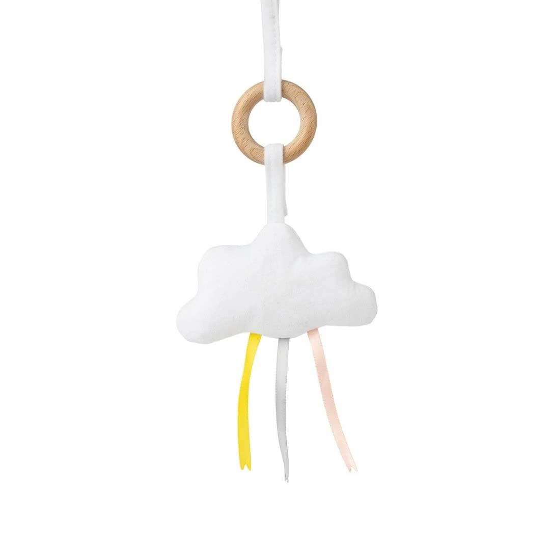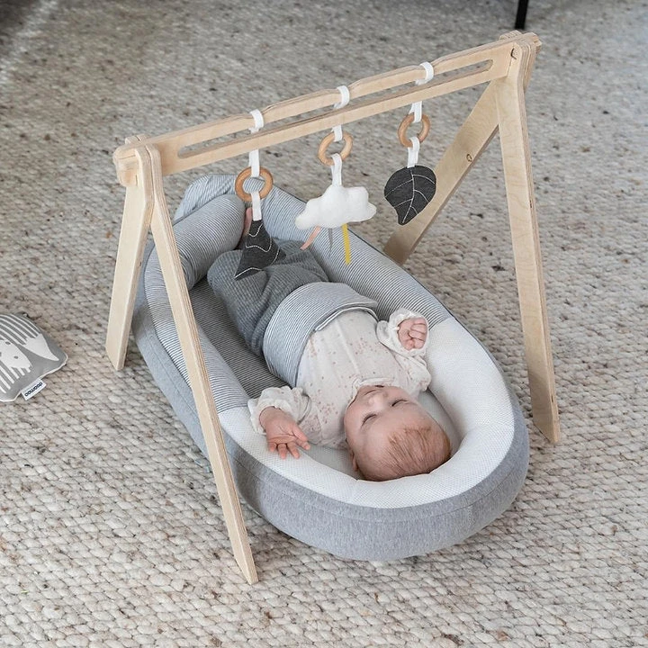This baby gym fits perfectly in the doomoo Cocoon but can also be used in a crib, on a playmat or with a bouncing chair. The toys are removable and can be adjusted in height. You can also attach other toys to the wooden baby gym.