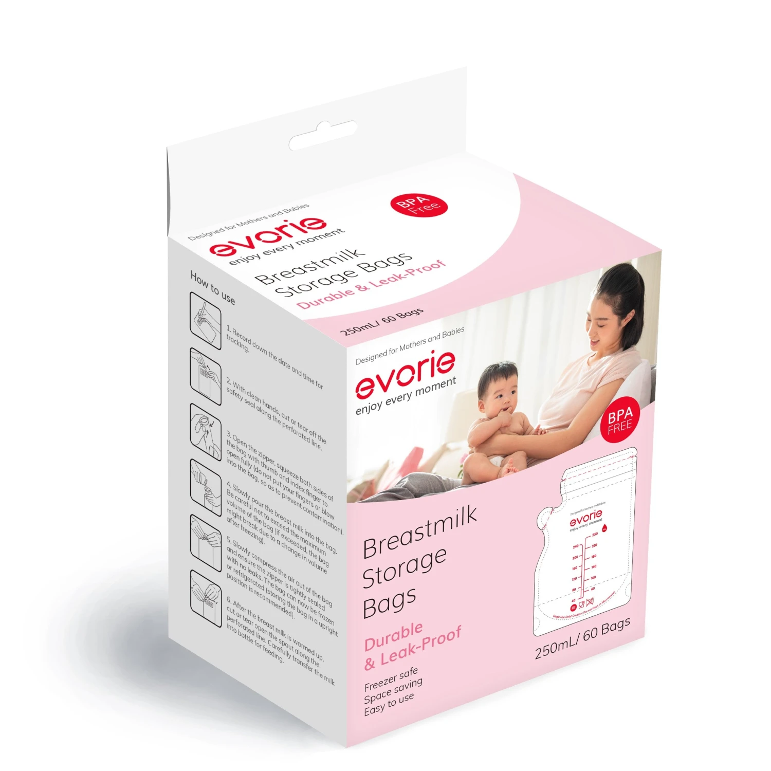 Evorie Premium Breast Milk Storage Bags are BPA-free, FDA approved and European Food-grade certified. It is uniquely designed to ensure that precious breast milk is not spilled, wasted or contaminated.