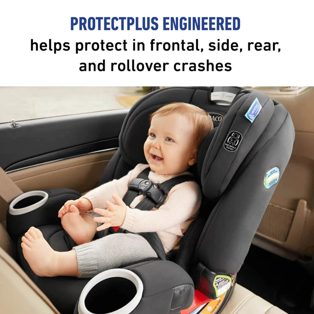 The 2 easy-to-clean cup holders keep your child’s drinks and snacks close at hand. Removable plush head and body inserts help to keep your infant feeling cradled and comfortable. Steel-reinforced frame provides strength and durability for years of use. The car seat is Graco® ProtectPlus Engineered™ to help protect in frontal, side, rear, and rollover crashes.