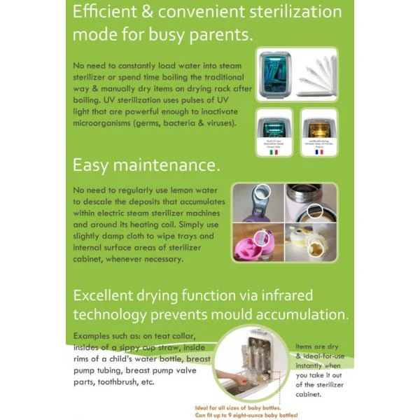Can also be used to sterilize other children items (eg. water bottle, feeding accessories, teether, pacifier, toothbrush, nasal aspirator, comb, toys) and household items (eg. cutlery, dishware, cups, knives, cutting boards, nail clipper, razor).