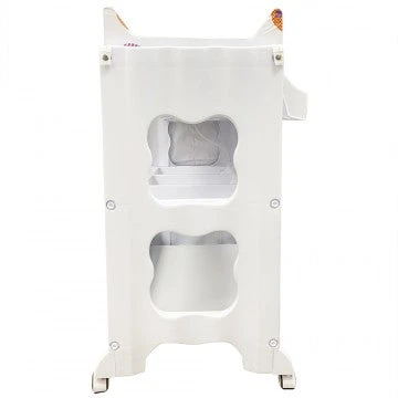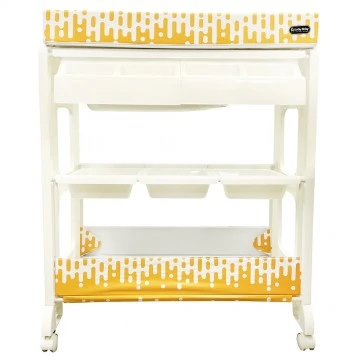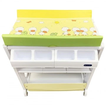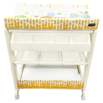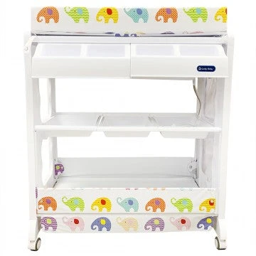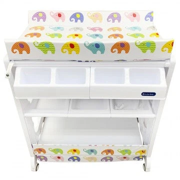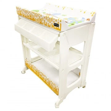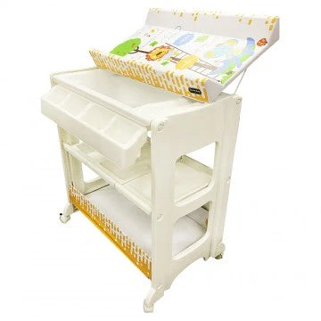 The changing station offers parents the comfort and practicality of an elevated bathing station, dedicated only to baby bath time. Keep towels, soap, shampoo, nappies, toys and all other supplies neatly organized and within easy reach in the caddy compartments or lower storage space below the bath. The changing pad is made of soft cushioned vinyl, it can be easily cleaned with soap and water. The stylish stand come with 4 safety wheel/stopper which enable mobile or stable. Our changing station is designed to allow an infant to lie down or a toddler to sit up while bathing – Easy storage.