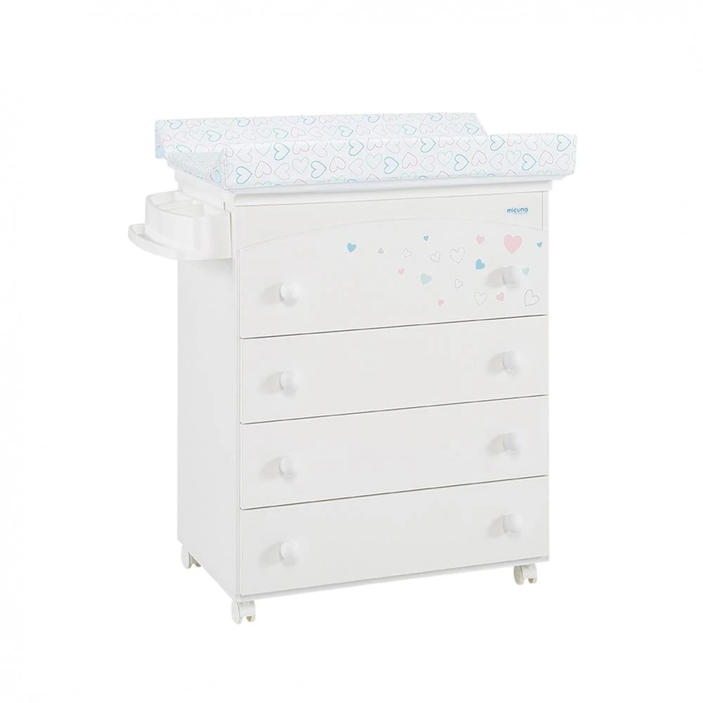 It comes with a chest of drawers bucket with soap dish and drain. On top, it incorporates a practical plastic changer with an elegant grey upholstery. Wheels included to help its mobility.