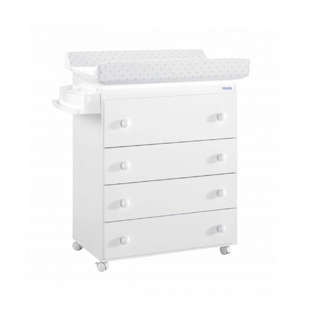 It comes with a chest of drawers bucket with soap dish and drain. On top, it incorporates a practical plastic changer with an elegant grey upholstery. Wheels included to help its mobility.