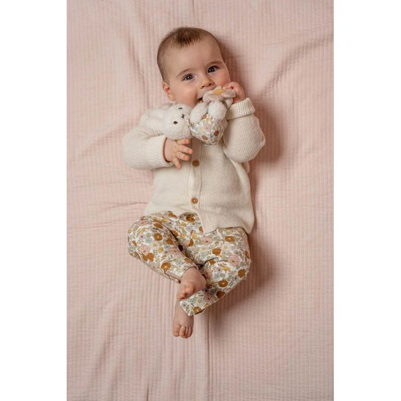 Grab, shake and snuggle! This soft little miffy is holding a fun toy that will make the sweetest sounds when you move and shake it. Dressed in Vintage Little Flowers, a Little Dutch design, miffy invites you to play with the rattle ring and snuggle with the pink little flower she picked for you. The transparent ring contains little beads that start rattling when your baby moves miffy up and down and side to side. A classic toy, perfect for the playpen, that enhances hand-eye coordination and stimulates the senses.