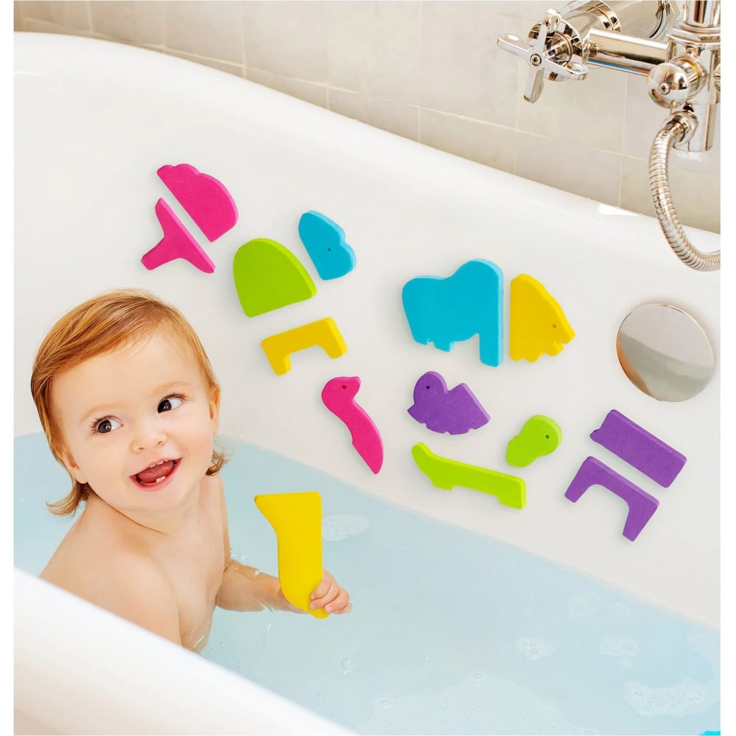 Calling all wild animal lovers! Get ready for a blast in the bath with the Safari™ Foam Puzzle Set. This creative bath toy features 33 foam animal shapes that double as a freeform puzzle for endless learning and fun in the tub. Go wild mixing and matching shapes to create up to 500 one-of-a-kind animals! Each piece is made of soft, durable foam that floats on water and clings to bathroom walls when wet. With so many possible combinations, your little explorer can go on a new safari adventure each day.