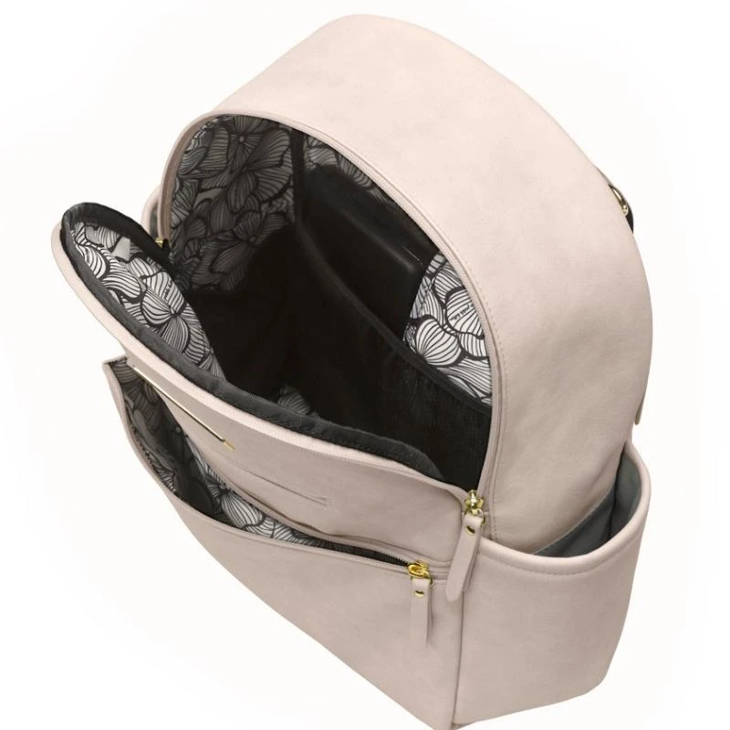 Our new Leatherette Collection’s matte faux leather combines a soft, supple hand with the durable performance every parent expects in a diaper bag. A modern spin on the classic backpack, the Ace brings a new, compact silhouette to the Petunia line. The bag’s soft, supple faux leather exterior is 100% wipe-able, while the inside features an easy-to-clean, stain-resistant lining in a signature Petunia print. To help keep mom organized, this Ace Leatherette bag features premium hardware and thoughtful details throughout, including two front zippered pockets – perfect for sunglasses and cell phones – a spacious main compartment, and deep exterior pockets that will help keep bottles, pacifiers and bibs at the ready.
