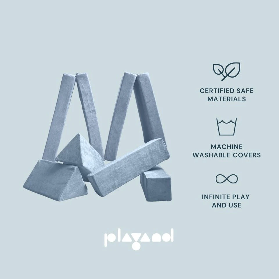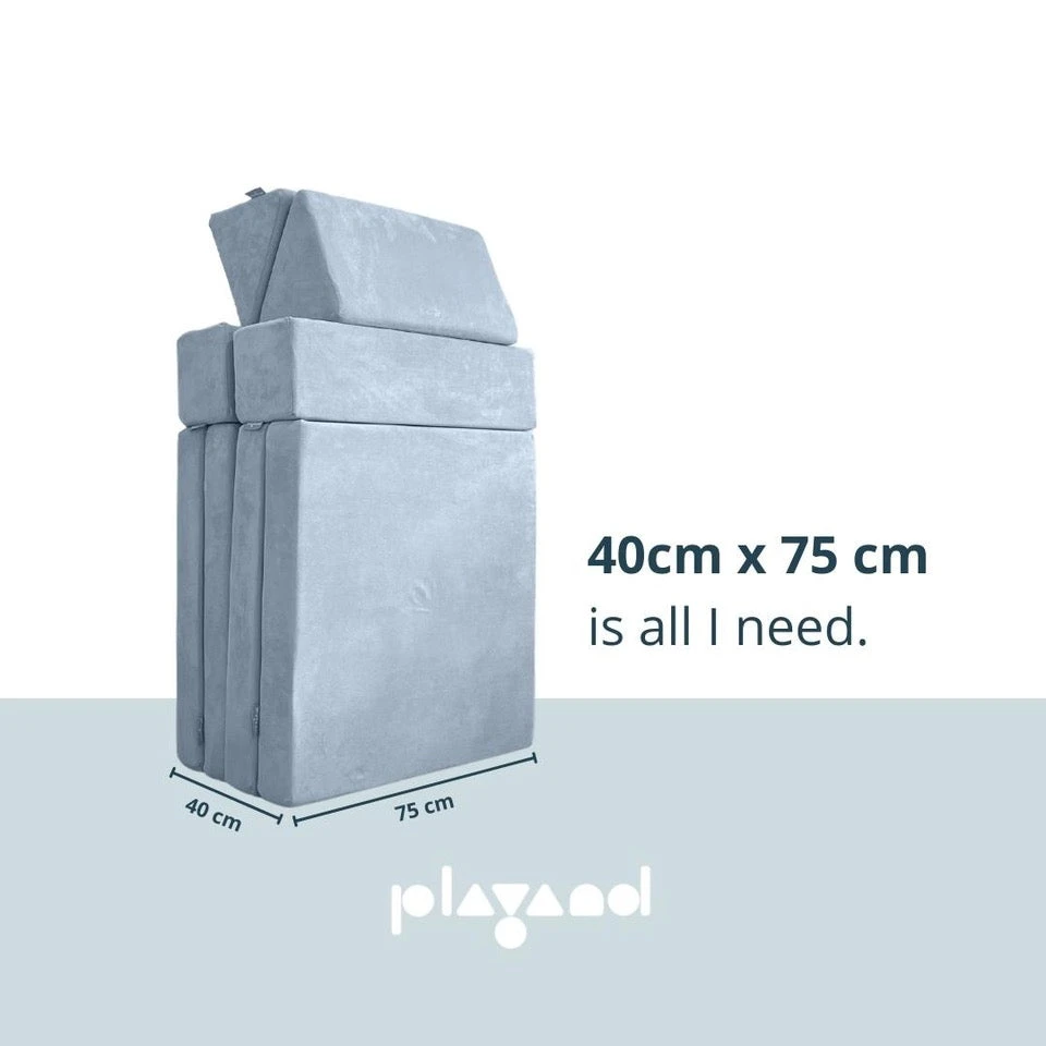 Playand Sofa is made up of 6 modular foam pieces (2 x bifold rectangular base, 2 x triangular blocks and 2 x rectangular blocks), made entirely from CertiPUR-US® certified polyurethane foam and covered in washable OEKO-TEX® certified polyester microsuede fabric.
