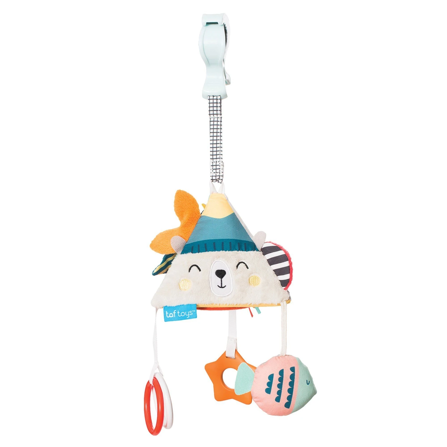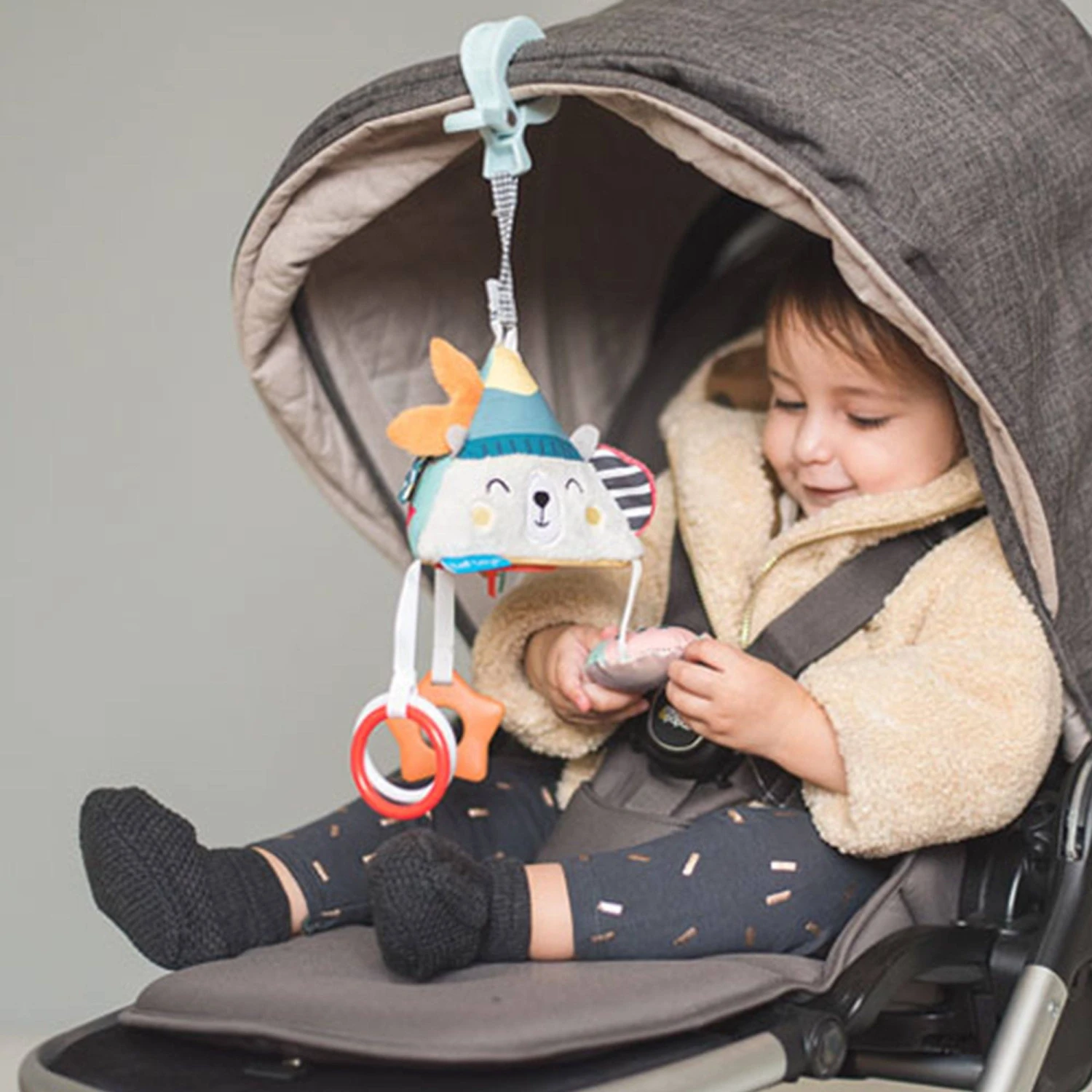 - With chime bell sound, baby-safe mirror, a teether, plastic rings, colorful ribbons, shiny printing, textured fabrics, crinkling parts and more.